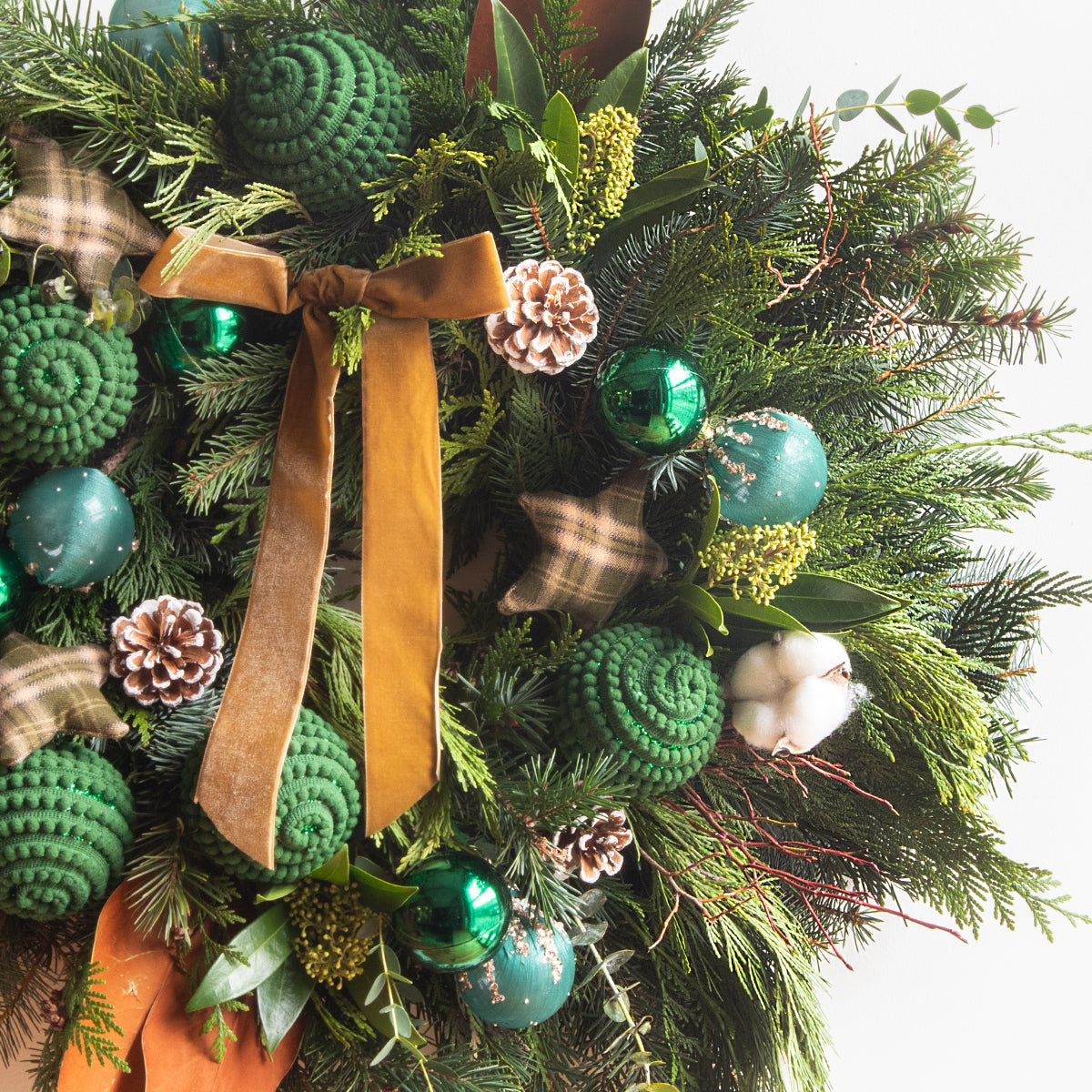 A rustic Christmas wreath with dried elements, rich earth tones, and a soft green ribbon, bringing natural warmth and woodland charm to your holiday decor.