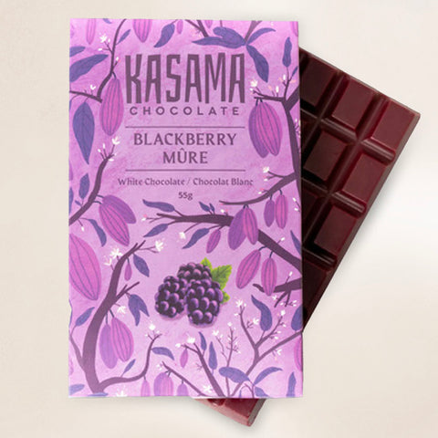 Indigo as the evening skies overlooking the many blackberry hedges on Vancouver's coastal beaches, this award-winning, vegan white chocolate bar is made from organic Peruvian cacao butter and contains no dairy, just a boatload of dried BC blackberries - equivalent to over 20 berries in each bar of chocolate.