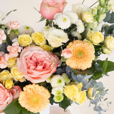 Introducing The Devon Fresh Flower Vase Arrangement! Experience the charm and beauty of the rolling English countryside with this picturesque masterpiece. The Devon Vase Arrangement showcases a harmonious blend of color, texture, and fragrance that will transport you to the idyllic landscapes of Devonshire.
