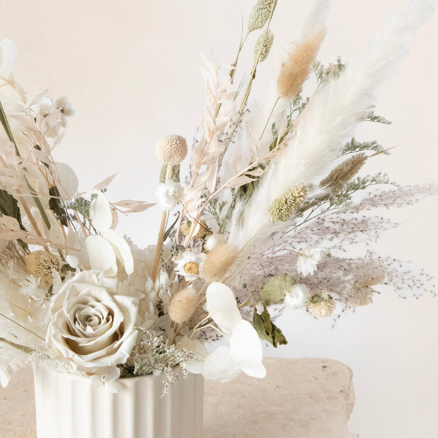 Un élégant mélange de fleurs séchées et de feuillage aux tons neutres, composé de roses stabilisées, d'herbe de la pampa et de délicates queues de lapin, présenté dans un vase en céramique nervuré. Idéal comme centre de table élégant et durable, il apporte un charme intemporel à tout espace.