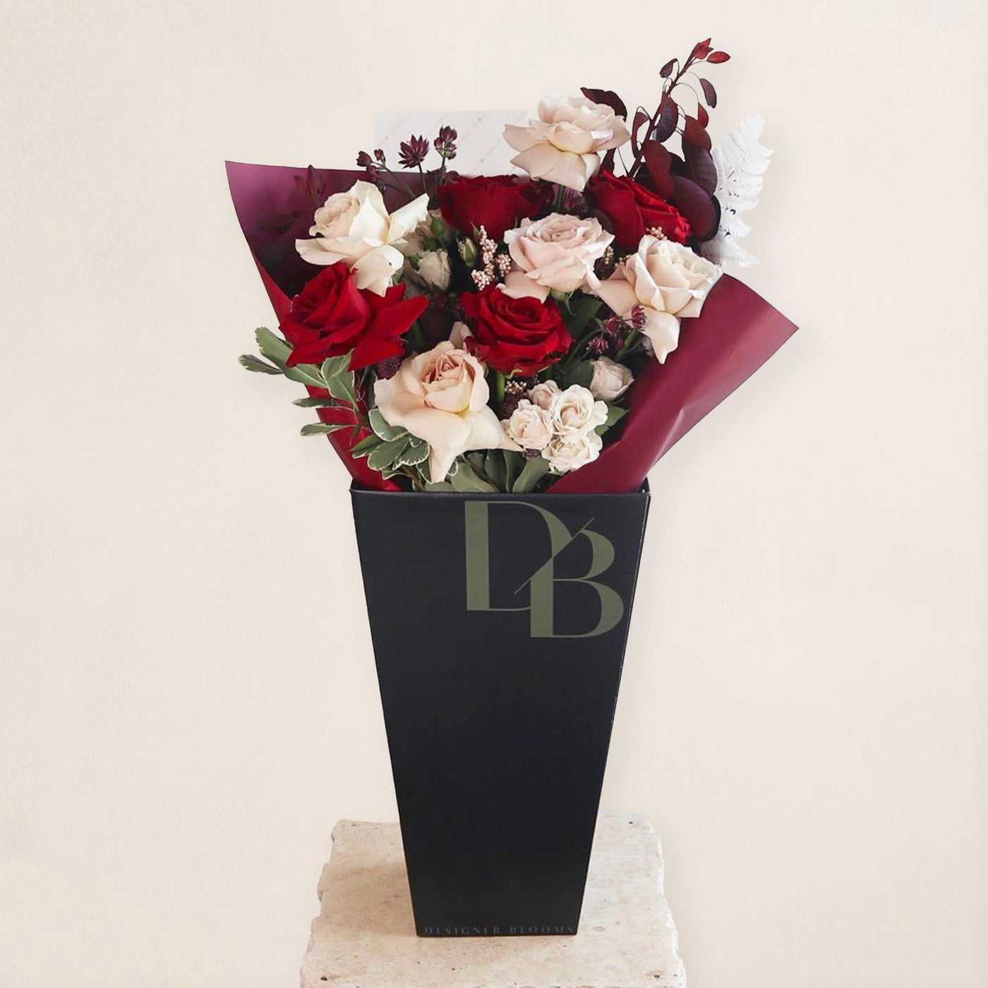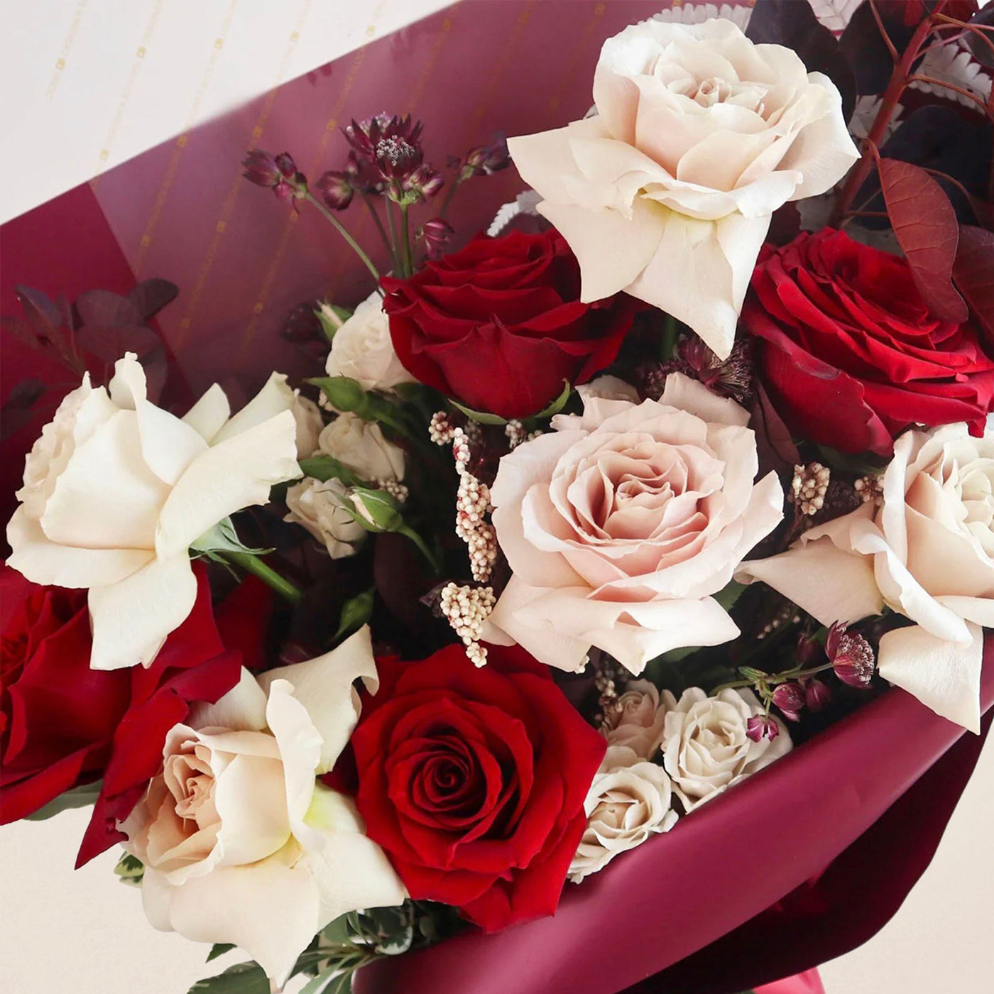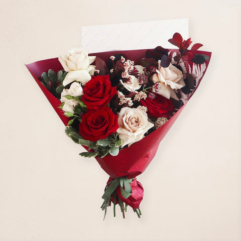 The elegant combination of fresh roses, in colours of red and blush, Astrantia, Eucalyptus, other greenery and Dried Fern make this bouquet truly special. Each flower is carefully chosen and arranged with loving attention by our experienced floral designers to create a stunning display of beauty. The Red Roses and Blush Roses provide a romantic touch, while the Astrantia flowers and Dried Fern add texture to the bouquet.