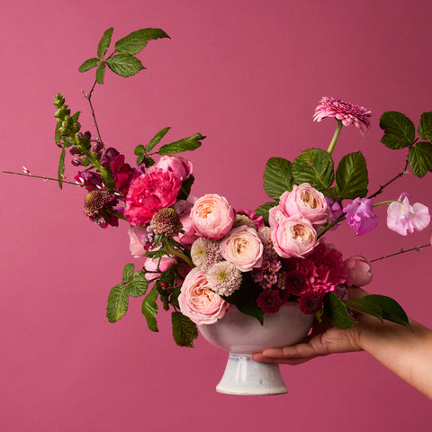 Fleurs focales : bouquets de roses, dahlias, lisianthus