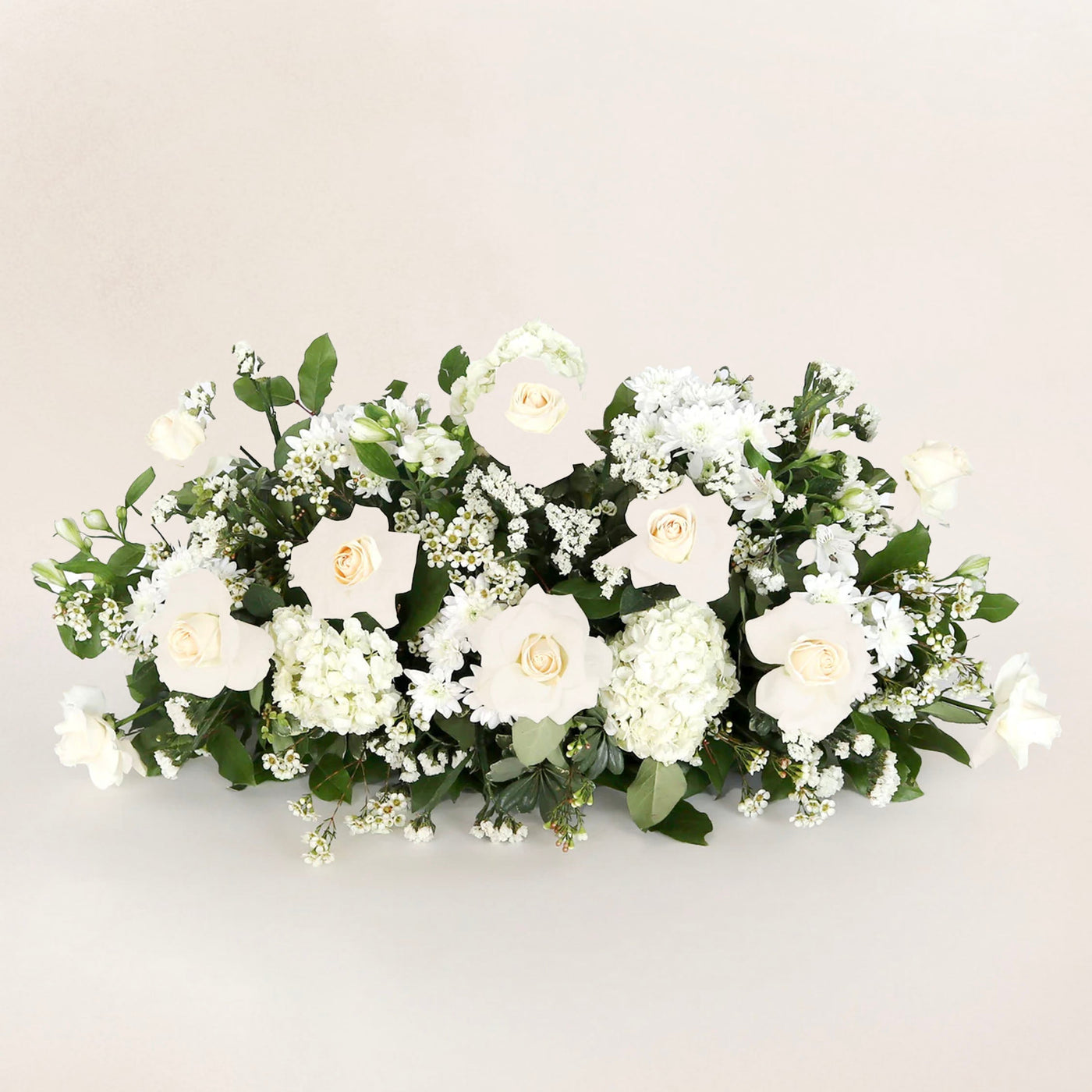 Notre élégante gerbe de cercueil blanche présente des roses crème de qualité supérieure parmi un lit d'hortensias blancs et de verdure fraîche.