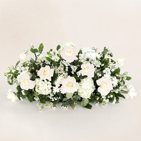 Our Elegant White Casket arrangement is a beautiful and symbolic choice for honoring the memory of your loved one. This delicate floral arrangement is composed of pristine white roses, lush hydrangeas, and dainty wax flowers, all carefully arranged to create a display of tranquility and peace.
