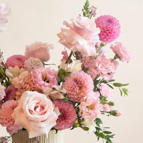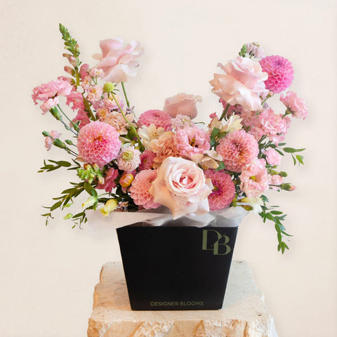 Le L'arrangement Osaka est un mélange gracieux d'élégance moderne et de romantisme intemporel, mis en valeur par une palette luxuriante de roses. Cet arrangement est une délicate célébration de la féminité, de la douceur et du charme.