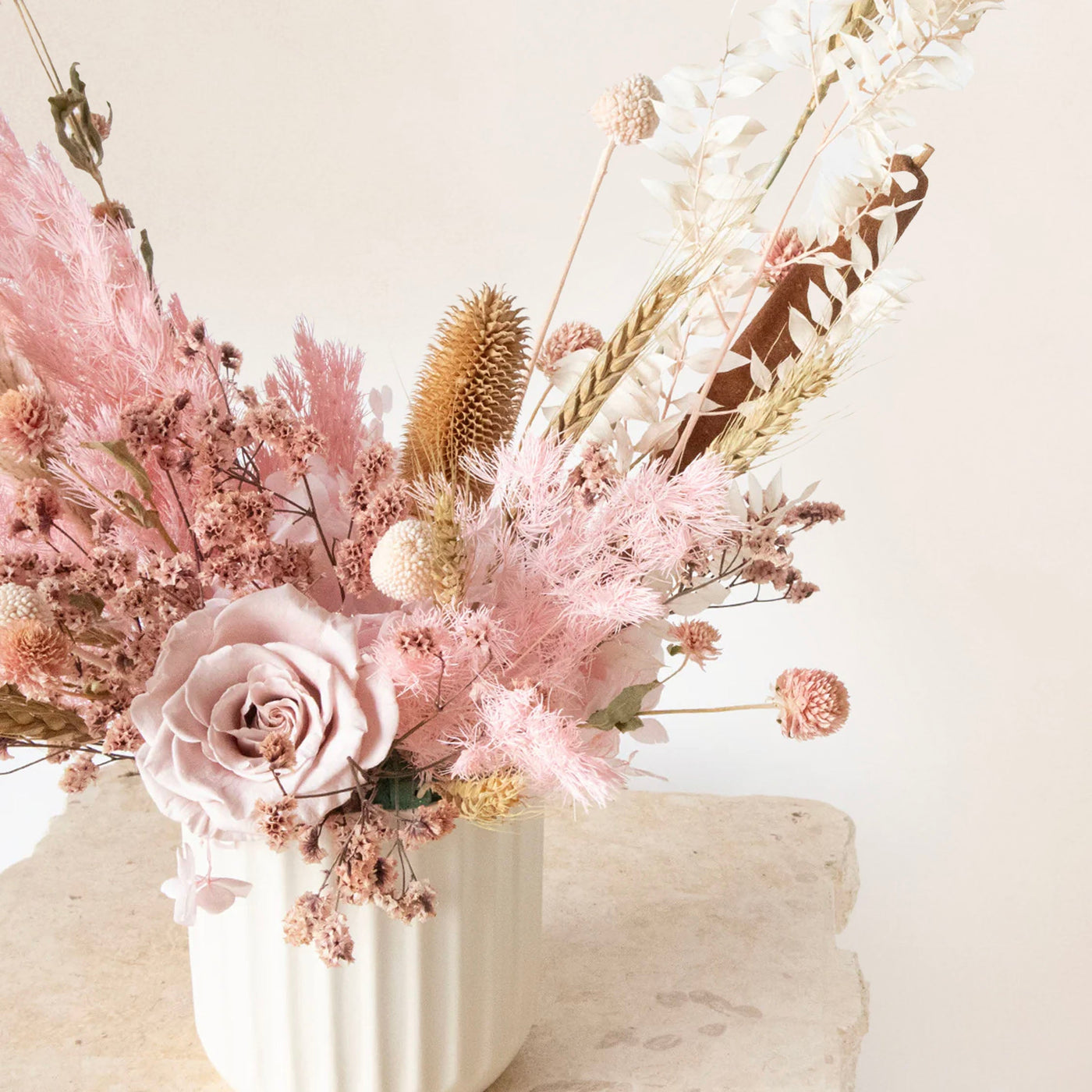 A romantic mix of pink and neutral dried flowers, featuring preserved roses, pampas grass, and textured blooms in a chic ribbed ceramic vase. A perfect choice to add soft, everlasting elegance to any room or occasion.